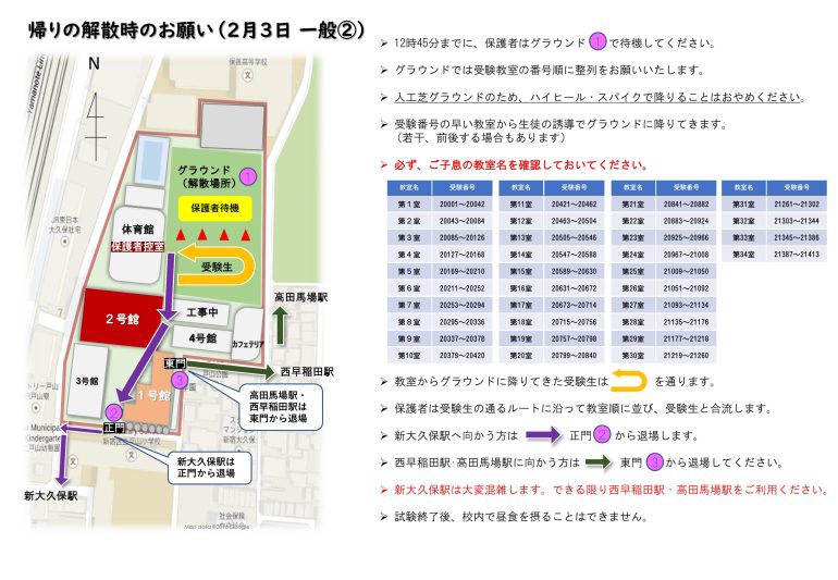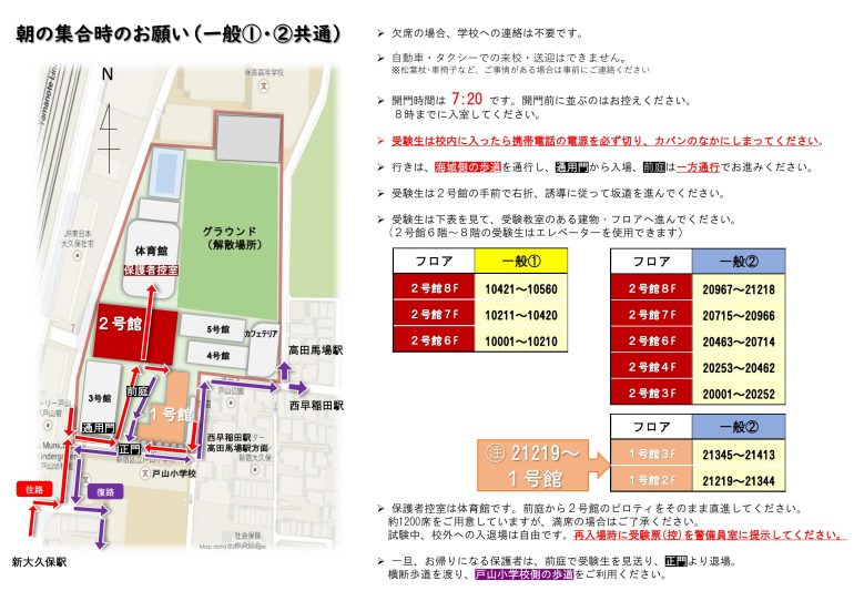 「朝の集合時のお願い」・「帰りの解散時お願い」(PDFファイル)をよく読み、受験フロア・教室をあらかじめご確認ください。