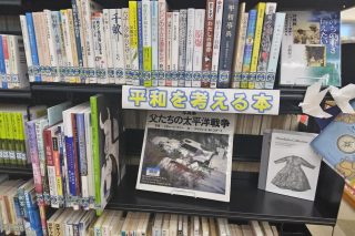 図書館に「平和を考える本」のコーナーがあります。